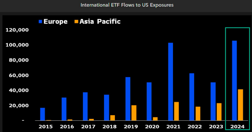 「歐洲投資者今年已向美國 ETF 投入創紀錄的 1,050 億美元,這也不足為奇。相比之下,標普 500 指數($SPY)上漲了 24%,而歐洲市場僅上漲 10%。亞洲市場也同樣錄得資金大幅流入。」