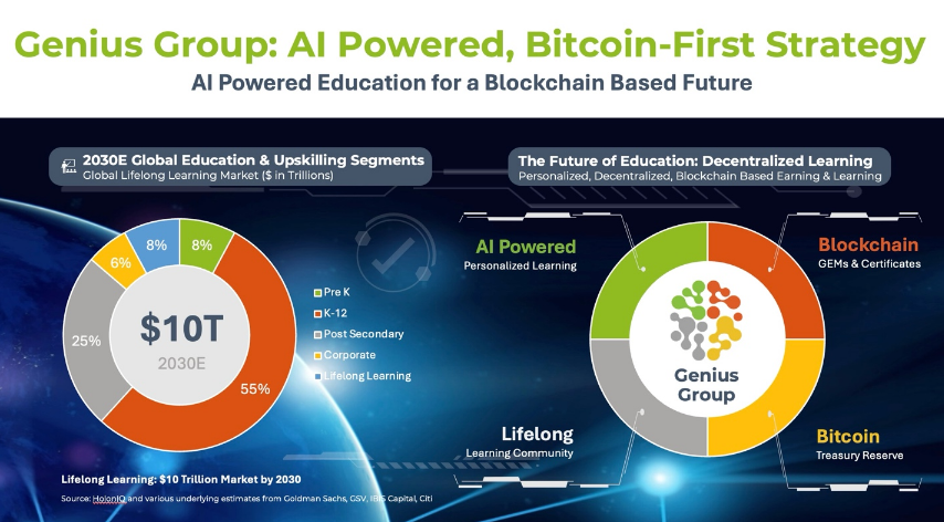 Genius Group 成立於 2002 年,總部位於新加坡,其 AI 驅動的教育科技面向各個層次的學習者,包括小學、中學、大學學生、企業家、企業及政府。該公司於 2022 年在美國證券交易所(NYSE American)上市。此次比特幣策略的推行,來自於公司董事會重組,增添了區塊鏈和 Web3 專家。
